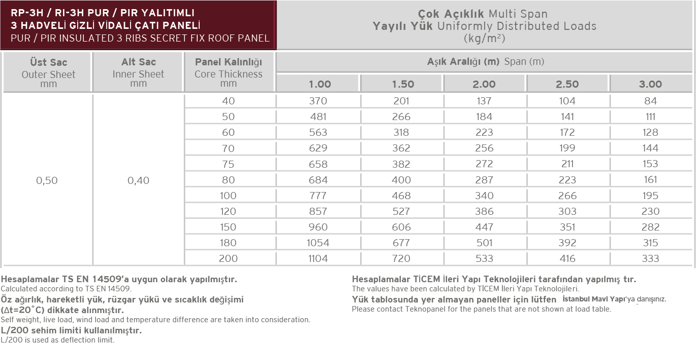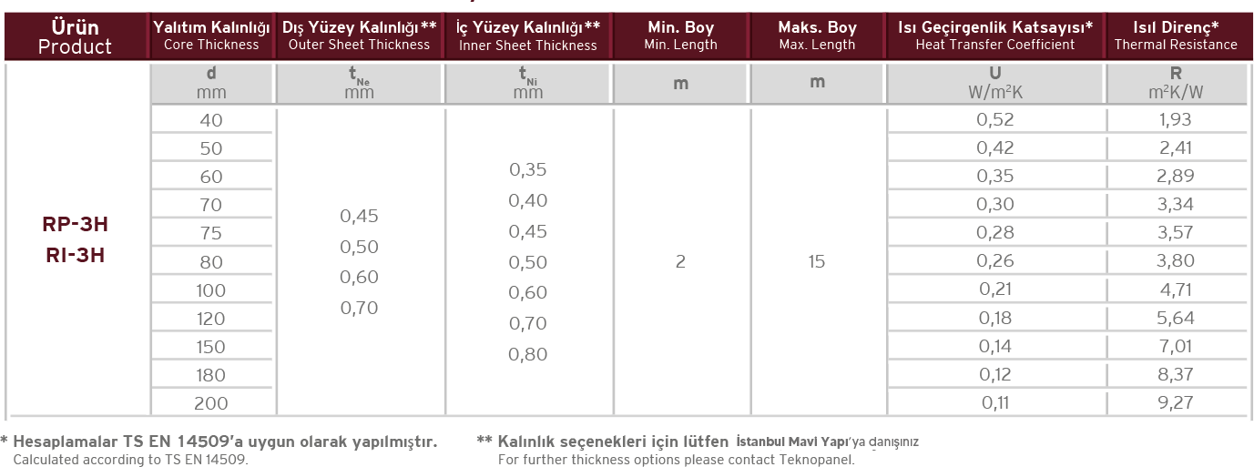 Gemäß TS EN 14509 variieren die U-Werte je nach Plattendicke zwischen 0,52 und 0,14 W/m2K.